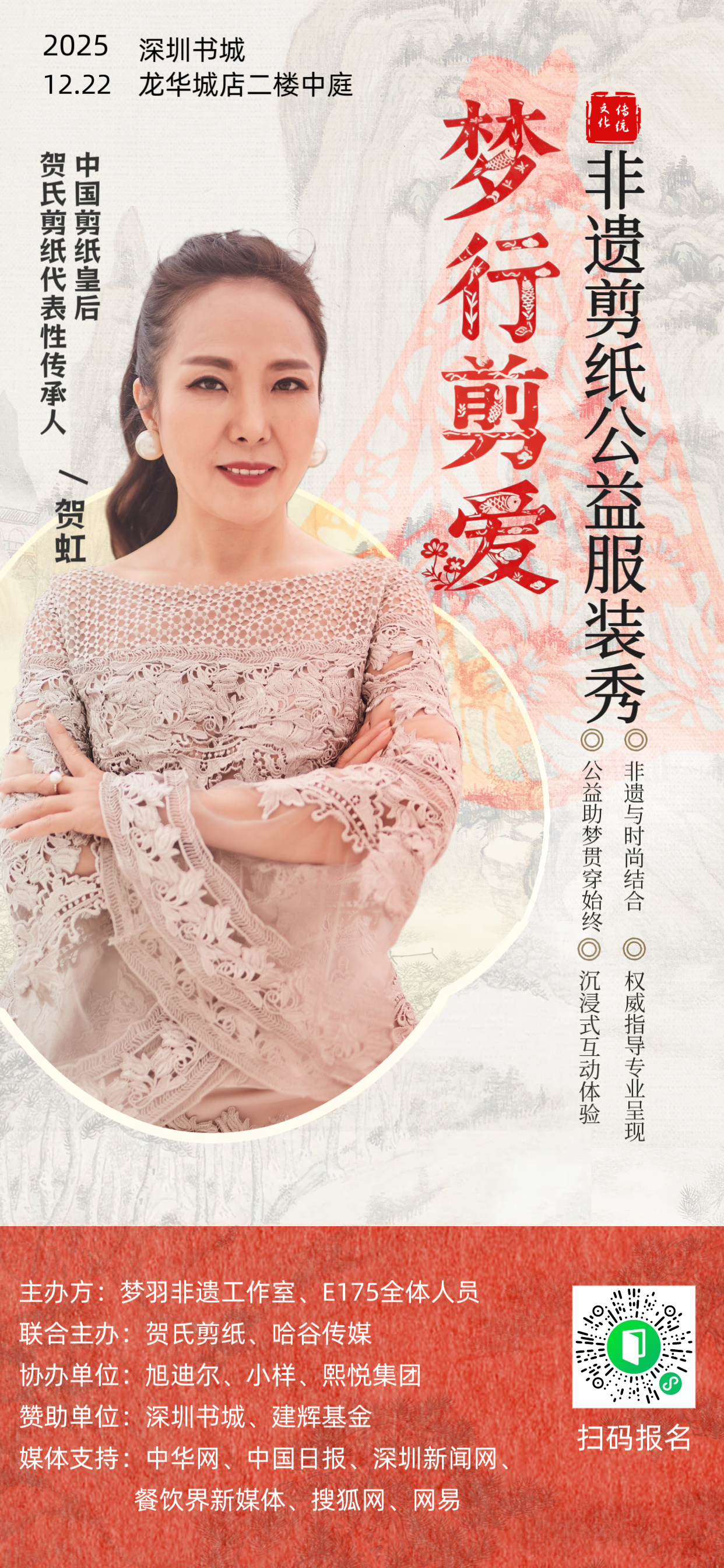 本次活動(dòng)由夢羽非遺工作室與精英行E175全體人員主辦,賀氏剪紙、哈谷傳媒聯(lián)合主辦,小樣、旭迪爾、熙悅集團(tuán)協(xié)辦,深圳書城、建輝基金贊助等支持,以“非遺活化+時(shí)尚表達(dá)+公益?zhèn)鬟f”為核心,呈現(xiàn)四大亮點(diǎn):