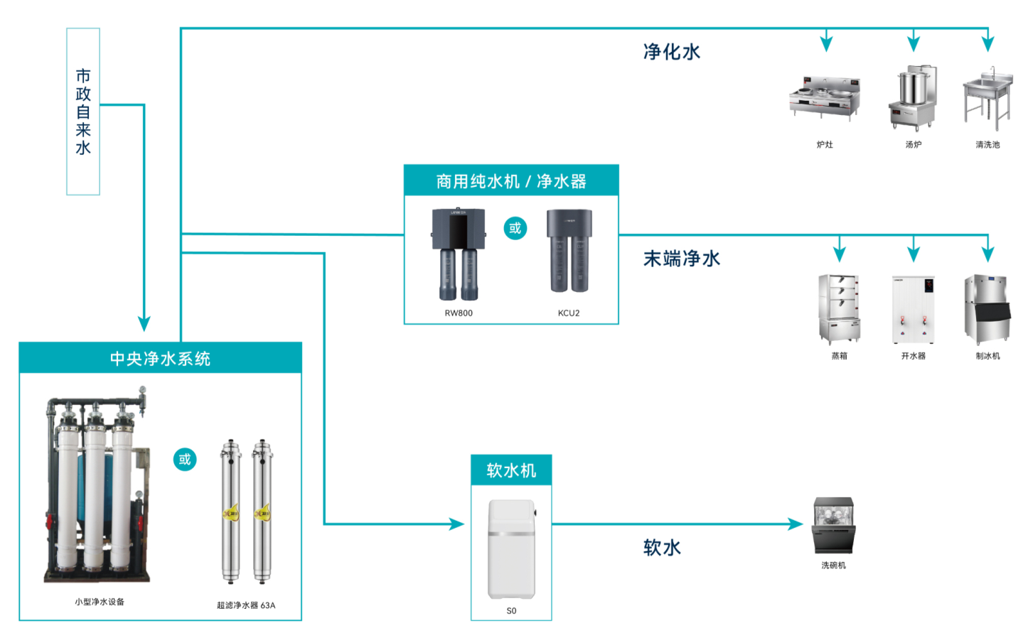 中端保障(烹飪/清洗區(qū)):為炒爐、湯鍋、洗碗機(jī)、洗菜池等區(qū)域供應(yīng) “凈化水”或“軟化水” 。重點(diǎn)解決水垢問題,保護(hù)昂貴的熱力設(shè)備,提升清潔效率,同時(shí)滿足大量清洗用水需求。
